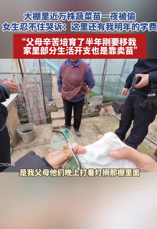据邓同学哭诉,这些菜苗是她父母辛苦培育了半年多的成果,原本正准备移栽到田里,是全家主要的经济来源,其中还包括她明年的学费。更令人气愤的是,小偷特意绕到大棚后方,避开了家中安装的监控设备,显然是有预谋地作案。